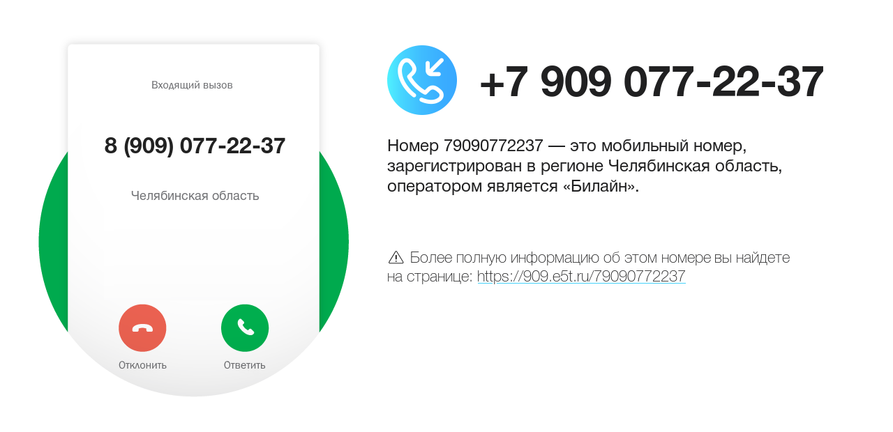 Телефон 8 (909) 077-22-37 относится к региону Челябинская область, оператором является компания ПАО «Вымпел-Коммуникации».