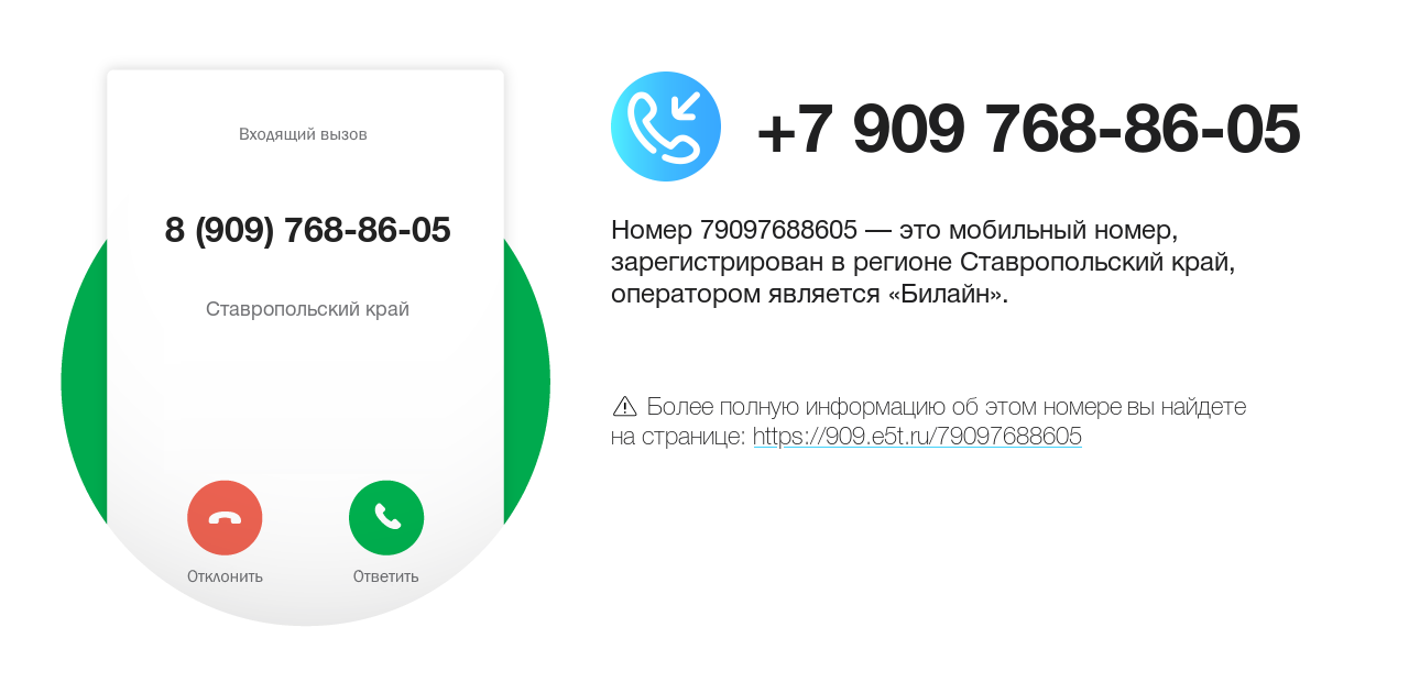 Телефон 8 (909) 768-86-05 относится к региону Ставропольский край, оператором является компания ПАО «Вымпел-Коммуникации».