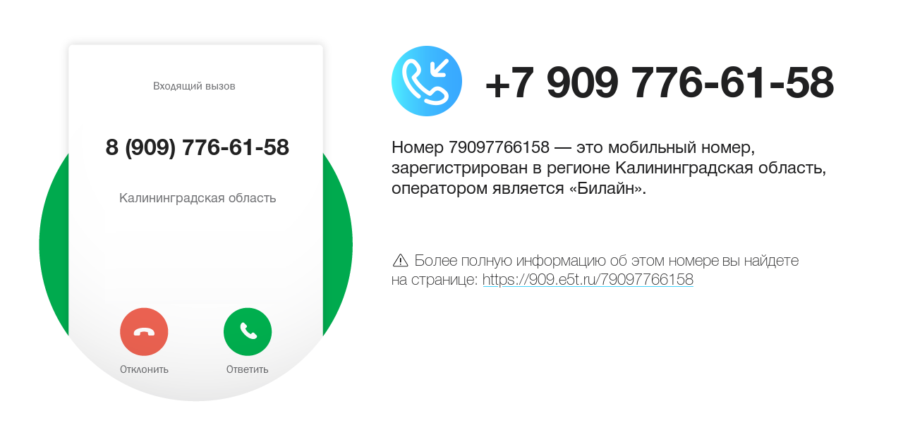 Телефон 8 (909) 776-61-58 относится к региону Калининградская область, оператором является компания ПАО «Вымпел-Коммуникации».